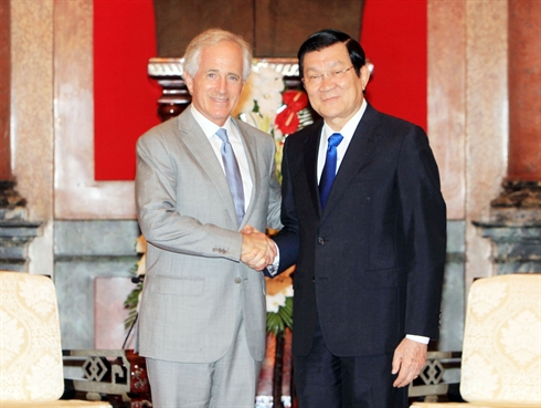 | Le président de la République, Truong Tân Sang (droite), et le sénateur Bob Corker, membre du Comité des affaires étrangères du Sénat américain, le 5 août à Hanoi. |
