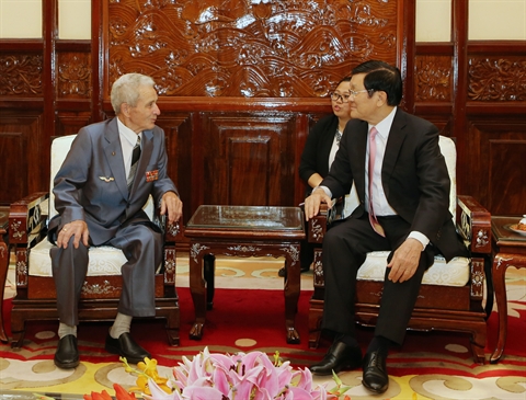 | Le président de la République Truong Tân Sang (à droite) a reçu le 10 jullet à Hanoi, Tadiyev Flyur, un ancien expert kazakh qui avait entraîné les pilotes vietnamiens durant la résistance anti-américaine. |
