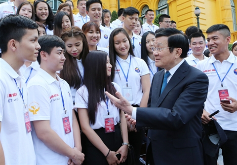 | Le président du Vietnam, Truong Tân Sang (droite), et des jeunes Viêt kiêu, le 14 juillet à Hanoi. Photo : Nguyên Khang/VNA/CVN |