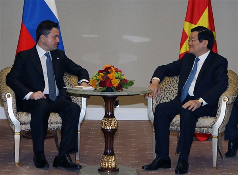 | Rencontre entre le président vietnamien Truong Tân Sang (droite) et le gouverneur de la province de Moscou, Andreï Vorobiov, le 10 mai à Moscou. |