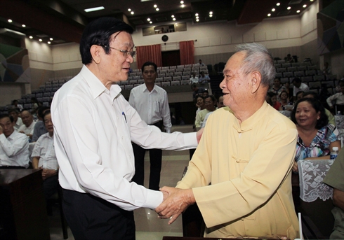 | Le président du Vietnam, Truong Tân Sang (gauche), rencontre l’électorat de Hô Chi Minh-Ville, le 2 décembre dans la mégapole du Sud. |