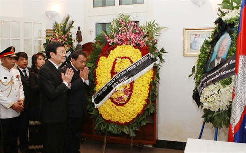 Présentant ses condoléances au roi-père Norodom Sihamoni, à la famille royale et au peuple cambodgien, le président Truong Tân Sang a consigné dans le registre de deuil ses regrets extrêmes pour le feu Roi-père Norodom Sihanouk, père du peuple cambodgien et grand ami du peuple vietnamien. Il a notamment écrit : "Nous apprécions hautement et reconnaissons pour toujours son soutien et son aide précieuse, ainsi que les sentiments intimes qu'il destinait au peuple vietnamien".