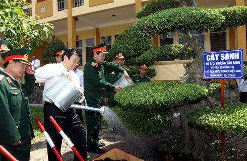 | Le président Truong Tân Sang (chemise blanche) a planté un arbre de souvenir au Commandement du Corps d'armée N° 4. |