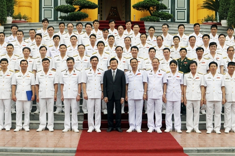 | Le président du Vietnam, Truong Tân Sang (1er plan, centre), a rencontré samedi 25 avril à Hanoi une délégation de cadres et d’individus représentatifs de la Marine populaire du Vietnam. |