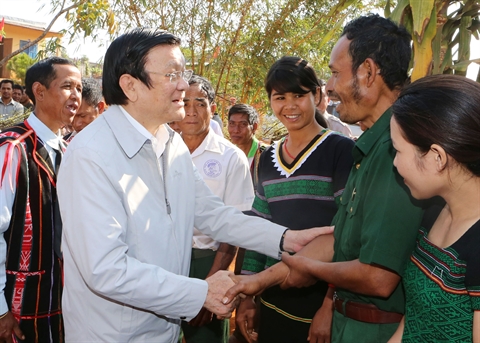 | Le président Truong Tân Sang (1er plan, à gauche)) rencontre les autorités et les habitants de la province de Dak Nông. |