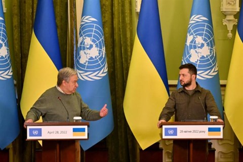 | Le secrétaire général de l'ONU Antonio Guterres (gauche) s'exprime lors d'une conférence de presse, aux côtés du président ukrainien Volodymyr Zelensky, jeudi 28 avril à Kiev en Ukraine. |
