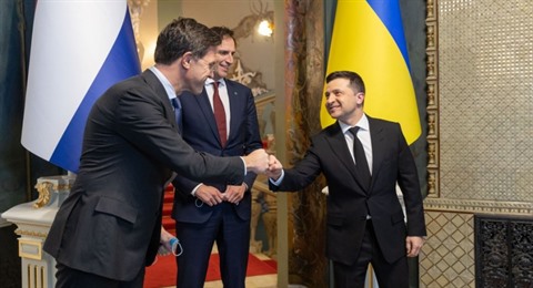 | Le président ukrainien Volodymyr Zelensky (droite) et le Premier ministre néerlandais Mark Rutte, à Kiev. |