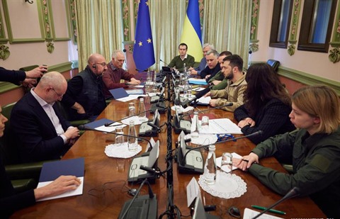 | Rencontre entre le président ukrainien Volodymyr Zelensky et le président du Conseil européen Charles Michel, 20 avril. |