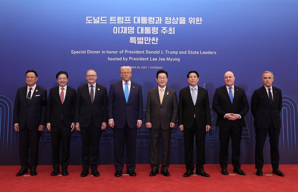 | Les président sud-coréen Lee Jae Myung (5e à gauche) et les dirigeants de l’APEC posent pour une photo de groupe. |