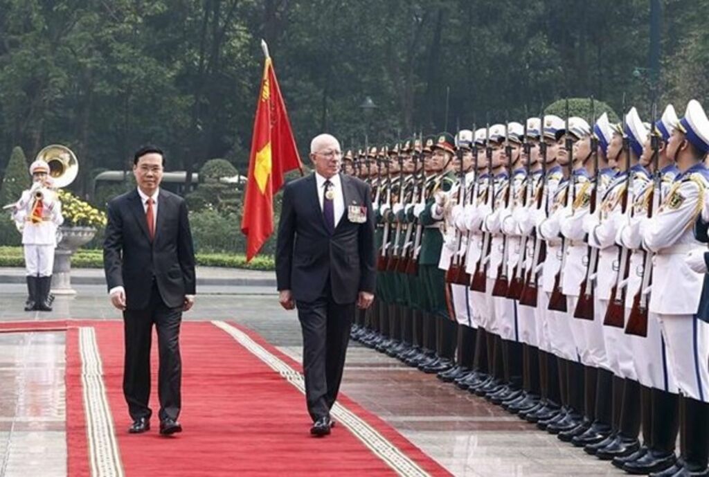 | Le président vietnamien Vo Van Thuong et le gouverneur général d’Australie David Hurley inspectant la garde d'honneur lors de la cérémonie de bienvenue, à Hanoi, le 4 avril. |