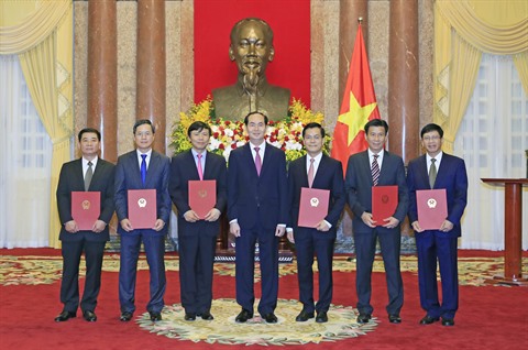 | Le président vietnamien Trân Dai Quang (centre) et six nouveaux ambassadeurs du Vietnam pour le mandat 2018-2021. |