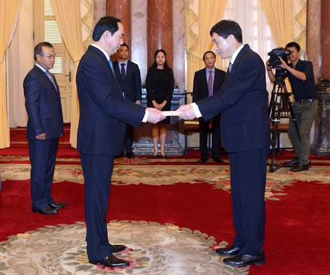 | Le président Trân Dai Quang (gauche) et l’ambassadeur sud-coréen, Lee Hyuk. |