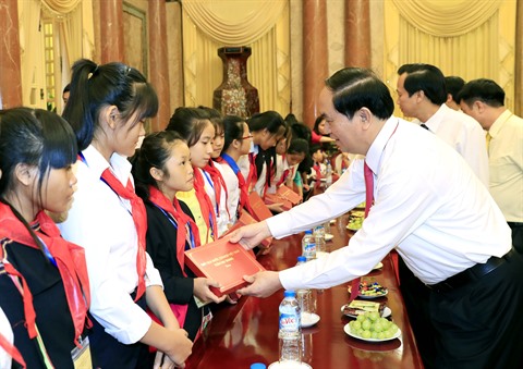 | Le président de la République, Trân Dai Quang, remet des cadeaux aux jeunes en situation difficile. |