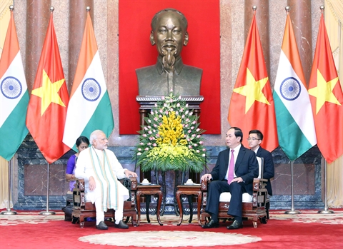 | Le Premier ministre indien Narendra Modi (gauche) est reçu par le président vietnamien Trân Dai Quang, le 3 septembre à Hanoï. |