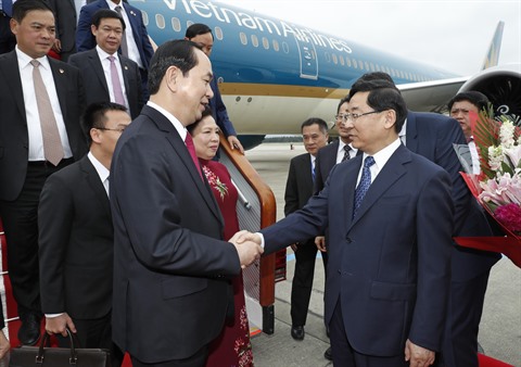 | Le président Trân Dai Quang (gauche) arrive le 13 mai à Fujian, en Chine. |