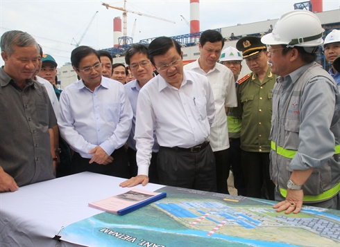 | Le président Truong Tân Sang (centre) visite le chantier de la centrale thermoélectrique de Mông Duong I. |