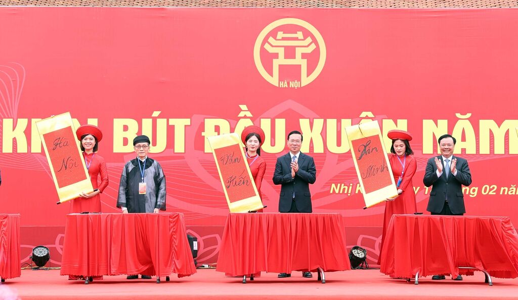 | Le président de la République, Vo Van Thuong (centre), a assisté dimanche matin, 18 février, à la cérémonie d’écriture de la Nouvelle Année. |