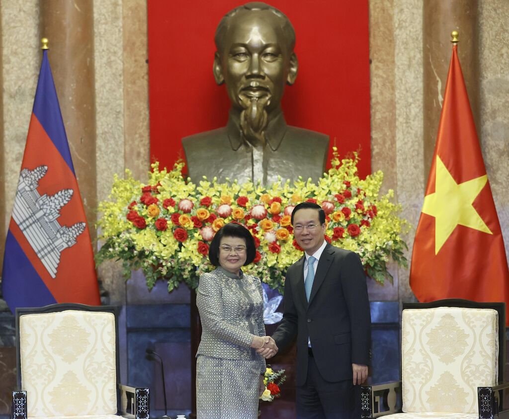 | Entrevue entre le chef de l'État vietnamien Vo Van Thuong et la présidente de l'Assemblée nationale cambodgienne Samdech Khuon Sudary. |