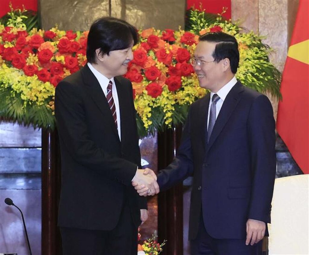 Le prince héritier Fumihito Akishino et la princesse Kito ont respectueusement transmis le message du roi Naruhito et de la reine du Japon au président Vo Van Thuong et à son épouse.
