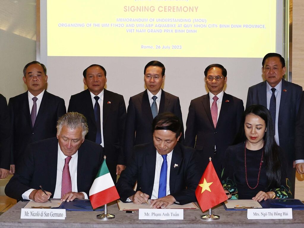 Le même jour, le président Vo Van Thuong a assisté à la signature d'un protocole d'accord pour coopérer à l'organisation du Championnat du monde de bateaux à moteur de Formule 1 - F1 H20 et le Championnat du monde d'aquabike UIM de Binh Dinh 2024 prévus en mars 2024 dans la ville de Quy Nhon. Les signataires étaient le Comité populaire de la province centrale de Binh Dinh et la H20 Racing.
