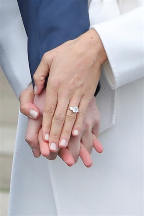 | La bague offerte par le prince Harry au doigt de sa fiancée, l'actrice américaine Meghan Markle lors d'une séance photo le 27 novembre à Kensington Palace à Londres |
