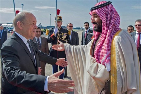 | Le ministre français des AE Jean-Yves Le Drian (gauche), accueille le prince prince héritier d'Arabie saoudite, Mohammed ben Salmane, au Bourget. |