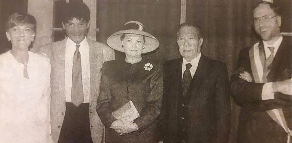 | L'ancien empereur Bao Dai (2e à droite) au mariage de son fils cadet Patrick-Édouard Bloch (2e à gauche). |