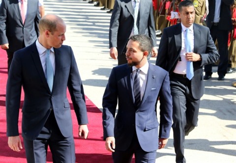 À son arrivée, le prince William, en costume noir, a reçu les honneurs de la garde royale jordanienne habillée du traditionnel Keffieh rouge et blanc, dans ce petit aéroport de l'est d'Amman. Le maire d'Amman, Youssef al-Chawarbeh, et des diplomates étrangers en poste en Jordanie étaient présents à cette cérémonie d'accueil. Le prince William se rendra lundi soir 25 juin en Israël où il visitera le lendemain à Jérusalem le mémorial de Yad Vashem, en mémoire des victimes de la Shoah. Il s'entretiendra avec le Premier ministre Benjamin Netanyahu et le président, Reuven Rivlin.
