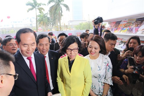| Le président de la République, Trân Dai Quang (gauche), au stand de la VNA. |