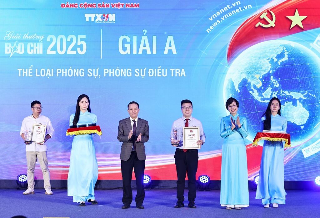 | La directrice générale de la VNA, Vu Viet Trang (2e à droite), et le vice-président permanent de l'Association des journalistes du Vietnam, Nguyen Duc Loi (3e à gauche), remettent le prix A à un ouvrage des correspondants de la VNA. |