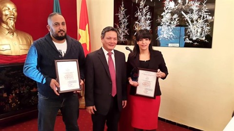 | L'ambassadeur du Vietnam en Algérie, Pham Quoc Tru (centre), remet le Prix national de l’information pour l'étranger du Vietnam à Aoura Racha (droite) et Ryad Abada, le 10 novembre à Alger. |