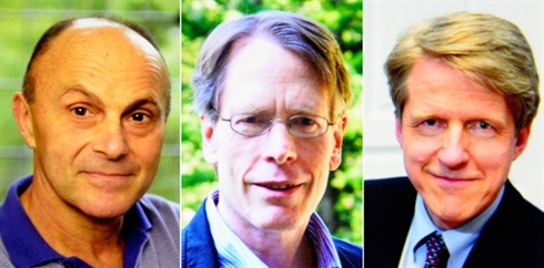 | De gauche à droite : Eugene Fama, Lars Peter Hansen et Robert Shiller, trois lauréats du prix Nobel d'économie 2013 |