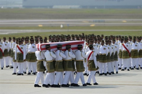 | Des soldats portent le cercueil d'une victime du crash du vol MH17 en Ukraine, en 2014 à Kuala Lumpur. |