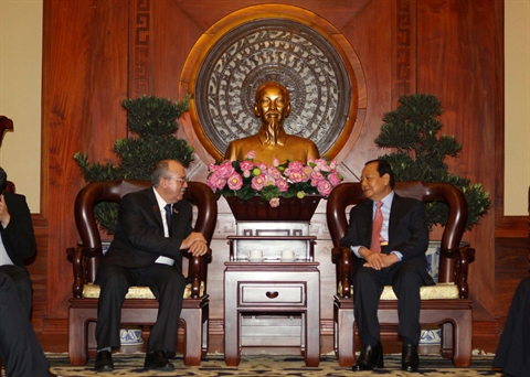 | Le secrétaire du Comité municipal du Parti communiste du Vietnam pour Hô Chi Minh-Ville, Lê Thanh Hai (droite), et le procureur général du Parquet populaire suprême cubain, Darío Delgado Cura, le 16 mars dans la mégapole du Sud. |