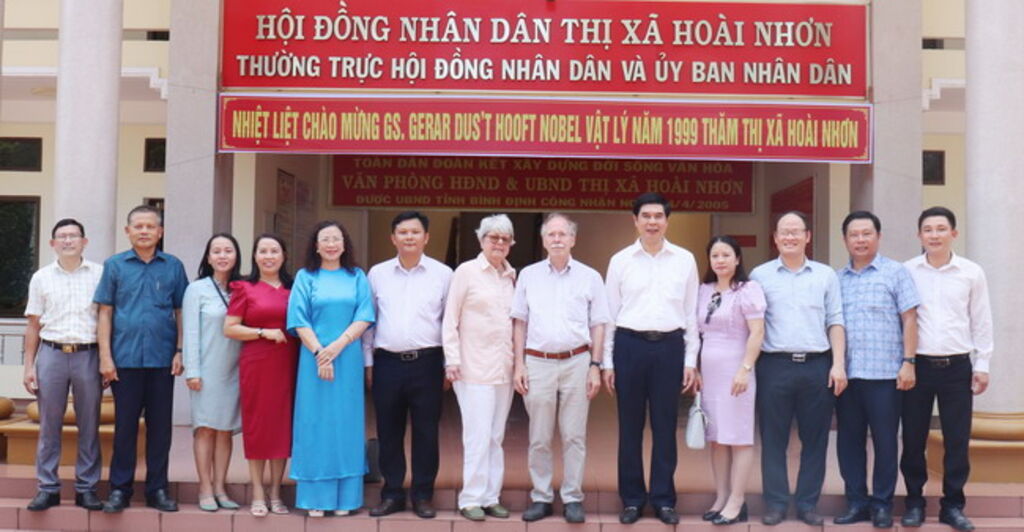 | Le Professeur Gerardus't Hooft et son épouse (centre) ont visité et pris des photos souvenirs au Comité populaire du chef-lieu de Hoài Nhon. |