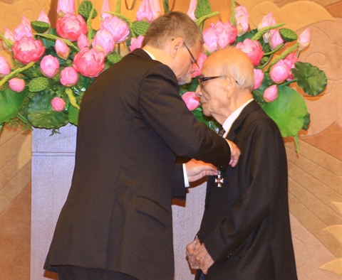 | Le président de l'Assemblée nationale hongroise László Kövéra (gauche) remet le 9 novembre à Hanoi la Croix de Chevalier au professeur Vu Khiêu. |