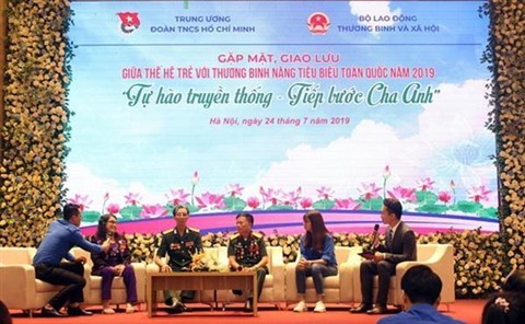 "Fier des traditions, suivre les pas de nos pères" est un programme de rencontre, d’échange entre jeunes et 400 invalides de guerres exemplaires de l’ensemble du pays, organisé le soir du 24 juillet à Hanoï par le Comité central de l'Union de la jeunesse communiste de Hô Chi Minh en coordination avec le ministère du Travail, des Invalides de guerre et des Affaires sociales.