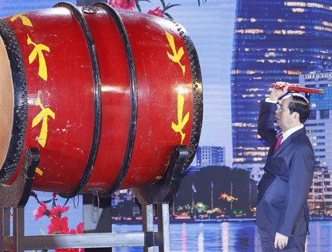 | Le président Trân Dai Quang frappe le tambour pour marquer l’ouverture du programme, le 20 janvier à Hô Chi Minh-Ville. |