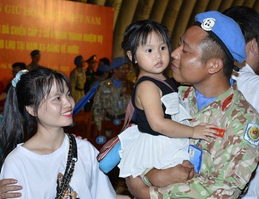 | La joie d'un membre de l'Hôpital de campagne de niveau 2 n° 4 lors de ses retrouvailles avec sa famille après un an de service au sein de la Mission de maintien de la paix des Nations Unies au Soudan du Sud. Photo : VNA/CVN |