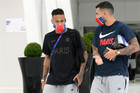 | Neymar et Leandro Paredes quittent l'hôtel du PSG, le 20 août à Lisbonne. |