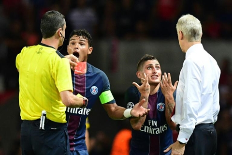 | Les Parisiens Thiago Silva (gauche) et Marco Verratti contestent le carton rouge adressé à l'Italien, lors du match contre Arsenal, le 13 septembre au Parc des Princes. |