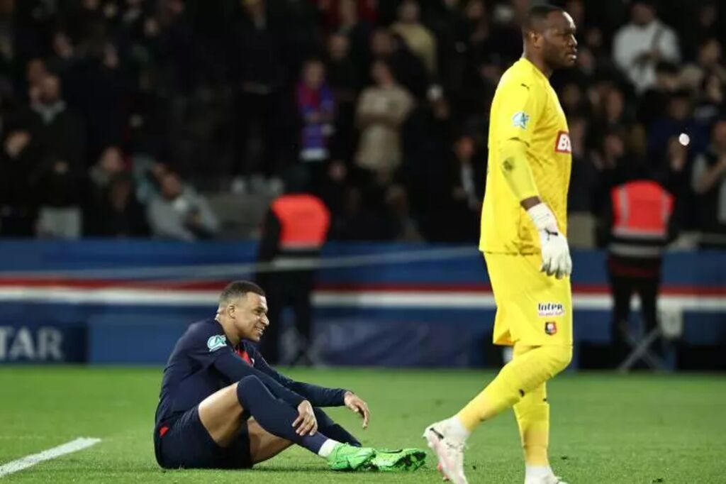 | Kylian Mbappé (assis) et le gardien du Stade Rennais Steve Mandanda lors de la demi-finale de la Coupe de France entre Paris et Rennes, le 3 avril à Paris. |