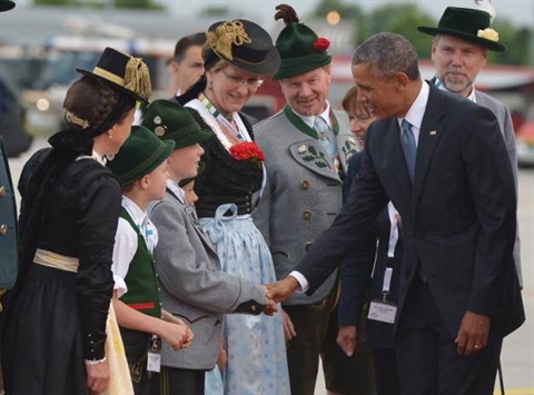 | Le président américain Barack Obama accueilli par des habitants en costume traditionnel à sa descente d'avion, le 7 juin à Munich. |