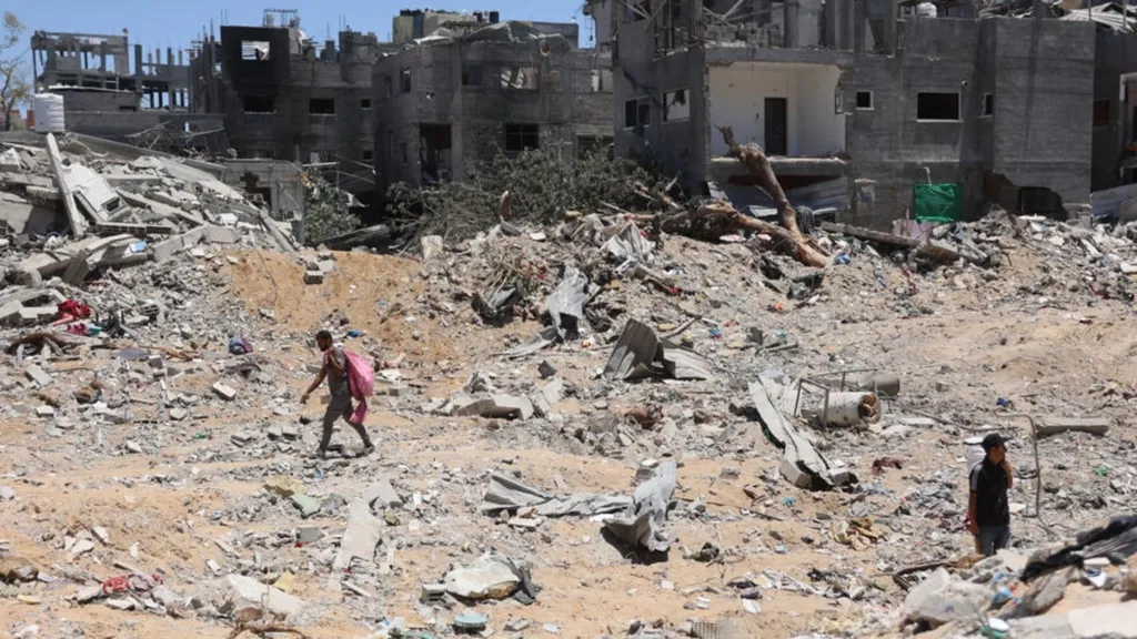 | Des Palestiniens marchent à côté de bâtiments détruits dans le camp de réfugiés de Jabalia, dans le Nord de la bande de Gaza, le 1er juin. |