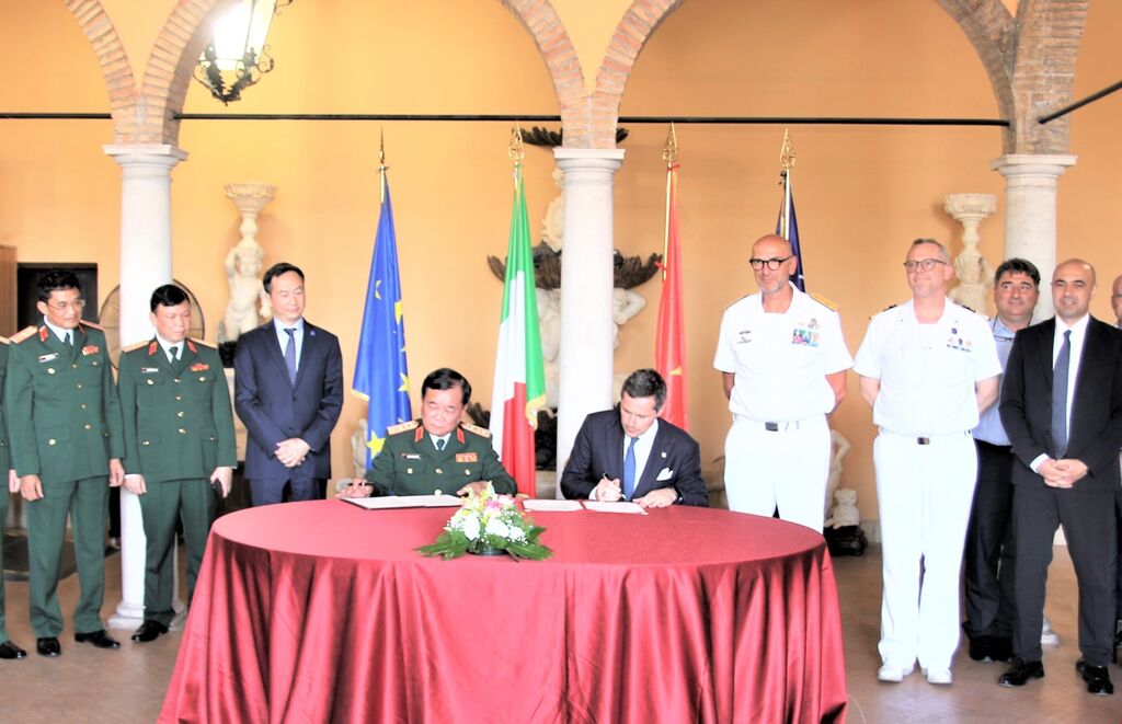 | Signature de procès-verbal du dialogue entre le vice-ministre vietnamien de la Défense, le général de corps d’armée Hoàng Xuân Chiên, et le secrétaire italien d'État à la Défense, Matteo Perego di Cremnago. |