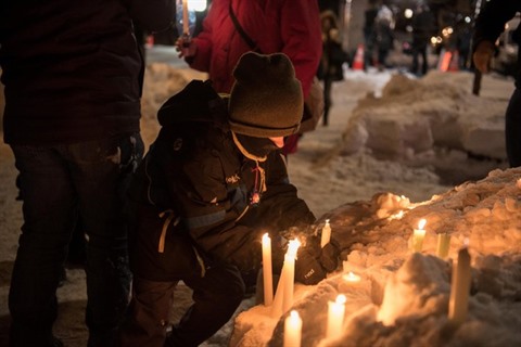 | Des bougies en hommage aux victimes de la fusillade de la mosquée de Québec, le 30 janvier 2017. |