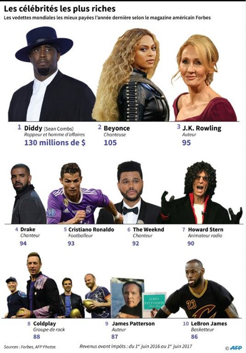 Diddy, 47 ans, de son vrai nom Sean Combs et connu en début de carrière sous le nom de Puff Daddy, a récolté quelque 130 millions de dollars de revenus entre juin 2016 et juin 2017, grâce à sa dernière tournée Bad Boy Family Reunion, un partenariat avec une vodka et la vente d'un tiers de sa marque de vêtements, selon le classement publié lundi par le magazine.