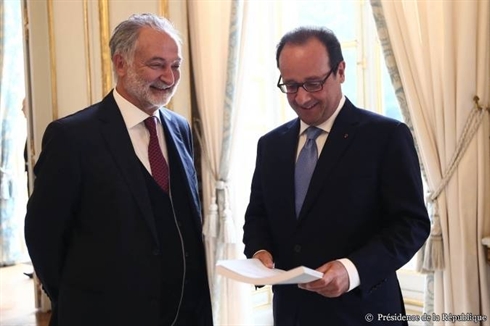 | Le conseiller français d’État honoraire Jacques Attali (gauche) et le président français François Hollande, le 26 août à Paris. |