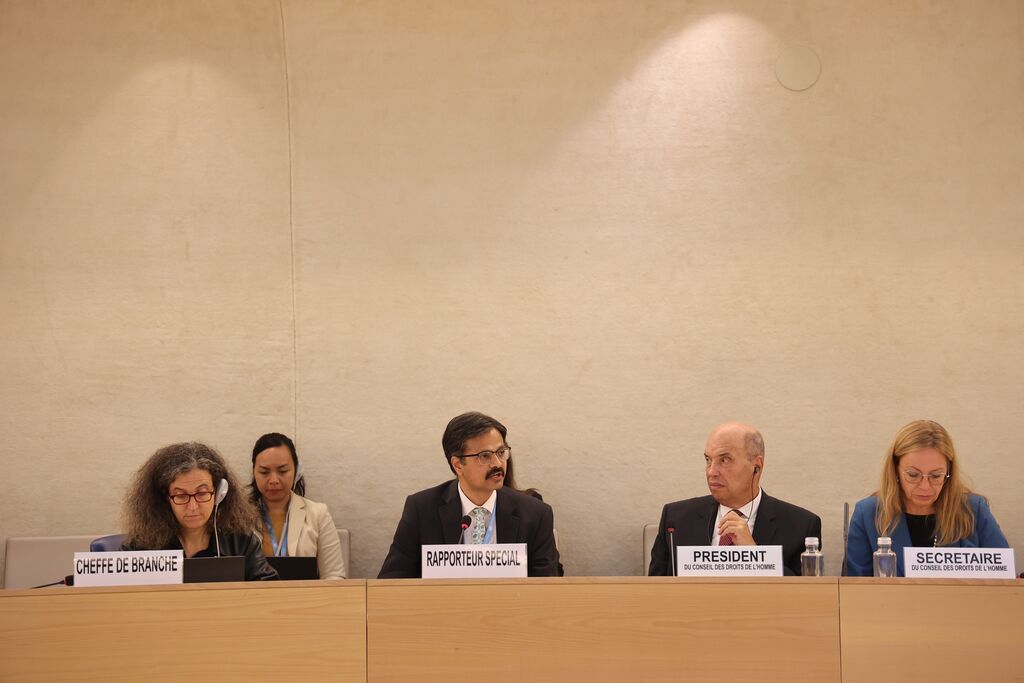 | Le rapporteur spécial des Nations unies sur le droit au développement, Surya Deva (2e à gauche), lors d'une séance de dialogue avec les pays sur ses activités au cours de l'année écoulée, le 18 septembre. |