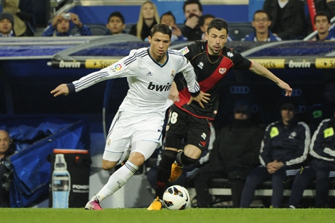 | L’attaquant de Real, Cristiano Ronaldo, à la lutte contre le milieu de terrain du Rayo Vallecano, Javier Fuego, le 17 février au stade Santiago Bernabeu. |